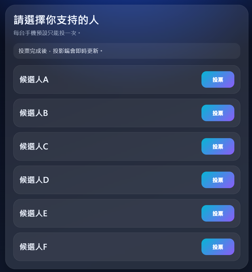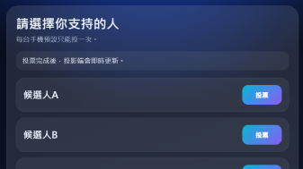 透過網頁或QR Code即可參與投票,結果即時更新與統計,適用於會議決策、活動投票與內部評選。
