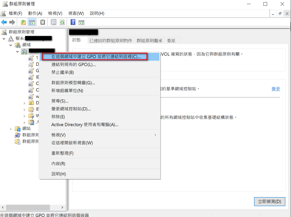 於AD伺服器上開啟群組管理員並在網域中建立新的GPO