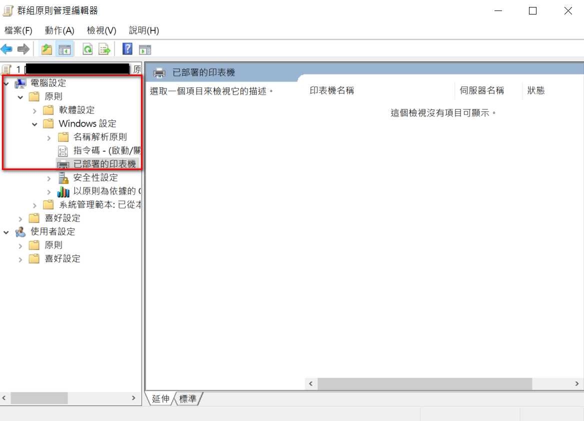 展開電腦設定中的【原則】→【Windows 設定】→【已部署的印表機】